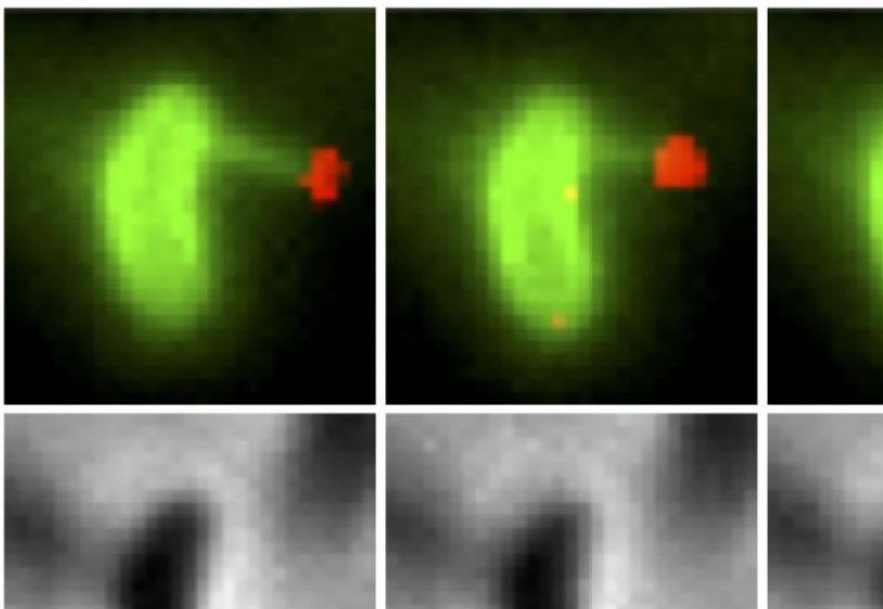 Первая в истории запись того, как бактерия «ворует» фрагмент ДНК из окружающей среды. Слева — то, как выглядит процесс, если пытаться его рассмотреть в обычный микроскоп. Справа — запись, полученная с применением специального метода флуоресцентного окрашивания. || Видео: Анкур Далиа (Ankur Dalia), Индианский университет