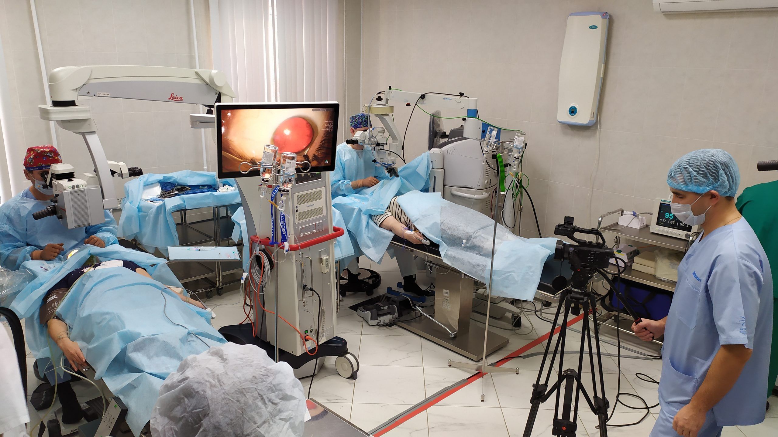Весь процесс операции, в том числе картинка операционного поля, транслировался из операционной комнаты на экраны выставочного центра музея Славцова, где собрались участники конференции.